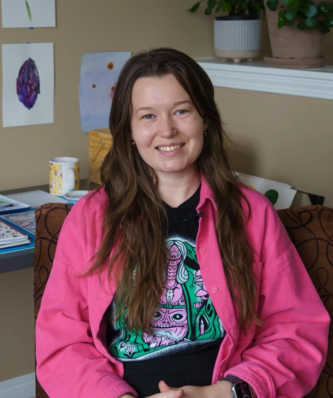 is an emerging Ukrainian visual artist based in Airdrie, Alberta. Her work explores experiences of displacement, trauma, and mental health issues using them as catalysts to investigate the healing potential of artistic expression. She engages with these themes through watercolour, collage, interactive art, and community-focused workshops that invite dialogue, connection, and reflection.